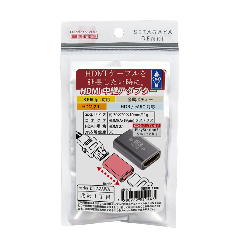 AR-HJ1はメス-メス接続の中継アダプターで、両方のコネクタにそれぞれHDMIケーブルをつなげることで一本の長いHDMIケーブルとして利用ができるようになります。 短いケーブルしか手元にない場合や、配線レイアウトを変更したい場合に大変便利です。 |