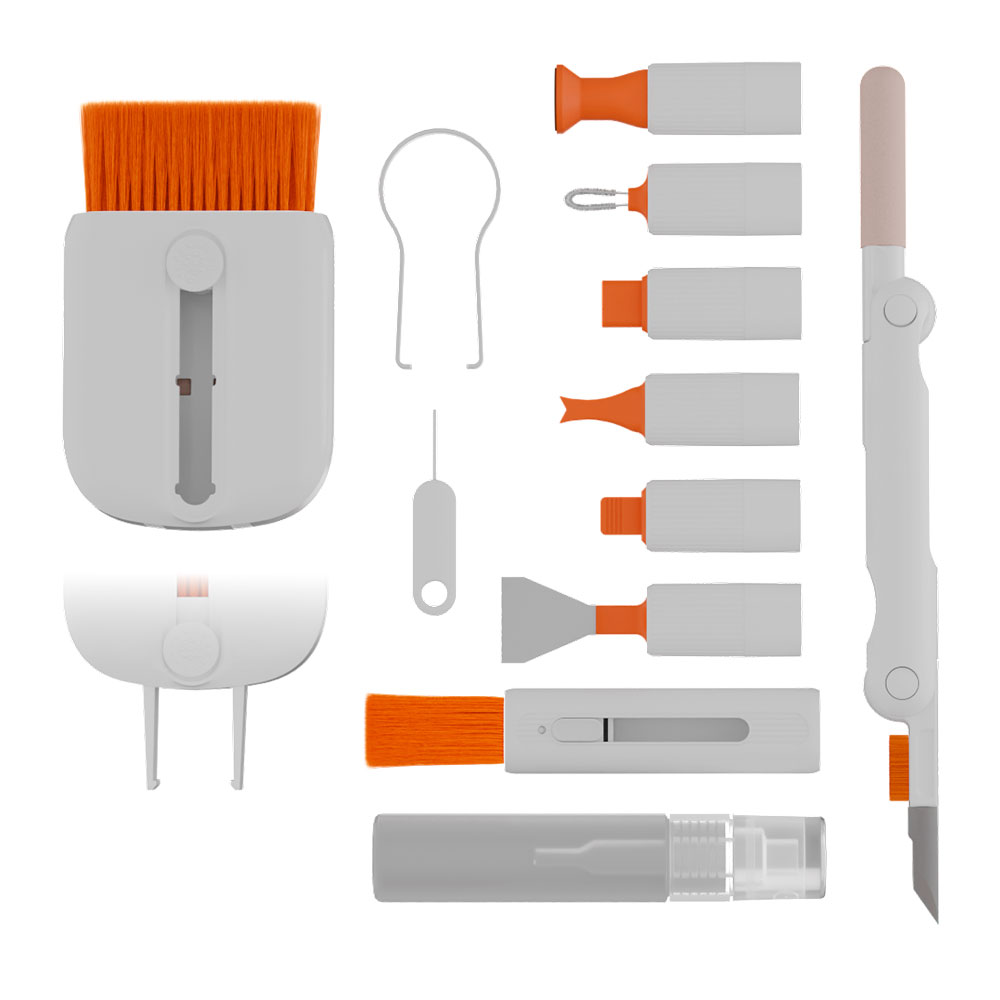 ブラシ(大)、キープラー、スイッププラー、SIMピン、スエードチップ、隙間用ブラシ、TypeC端子クリーナー、フチクリーナー(小)、Lightningクリーナー、フチクリーナー(大)、ブラシ(小)、ミニスプレーボトル、ペンクリーナー&イヤホンブラシの13種類を搭載。それぞれがパソコンのキーボード、スマートフォンの画面、イヤホンの音孔、充電端子など、デジタルデバイス特有の細かい部分を効果的に掃除できるよう設計されています。1つのキットで全てのデバイスをケアできる包括的なツールセットです。