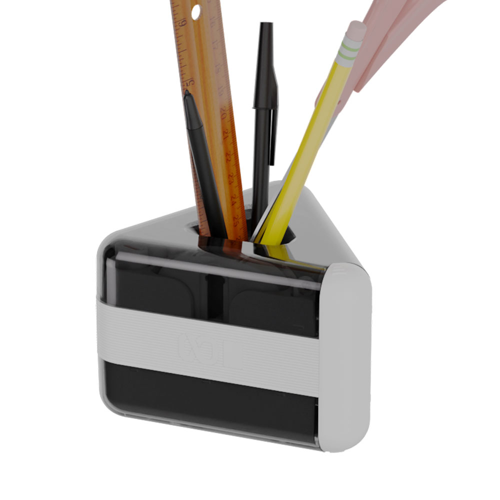 本体上部はペンホルダーとして活用できる設計で、ボールペンやマーカー、定規などの文房具を立てて収納できます。三角形の安定したフォルムにより、複数のペンを立てても倒れにくく、デスク上の文房具をすっきりと整理整頓。掃除ツールとペン立てが一体化しているため、デスクスペースを有効活用でき、必要な文房具も掃除道具もすぐ手に取れる位置に配置できます。約106×66×85mmのコンパクトサイズで場所を取らず、デスク周りをスマートに保ちます。