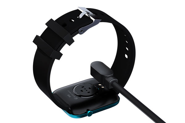 P10は付属の専用マグネット式充電ケーブルを使用して充電を行います。ケーブルを本体裏面の充電端子に吸着させると充電を開始致します。約2時間程度で満充電となります。